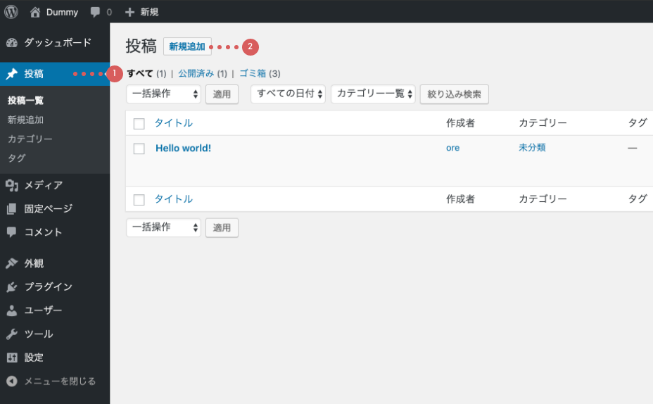 コンテンツの追加は「投稿」と「固定ページ」がある。
