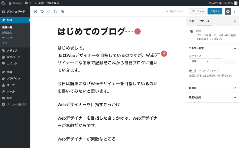 ブログを書く場合は、「管理画面」の「投稿」から書くことができる。