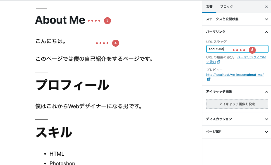 文書の設定の「パーマリンク」にある「URLスラッグ」にURLの最後の部分を指定できる。