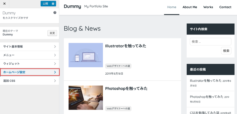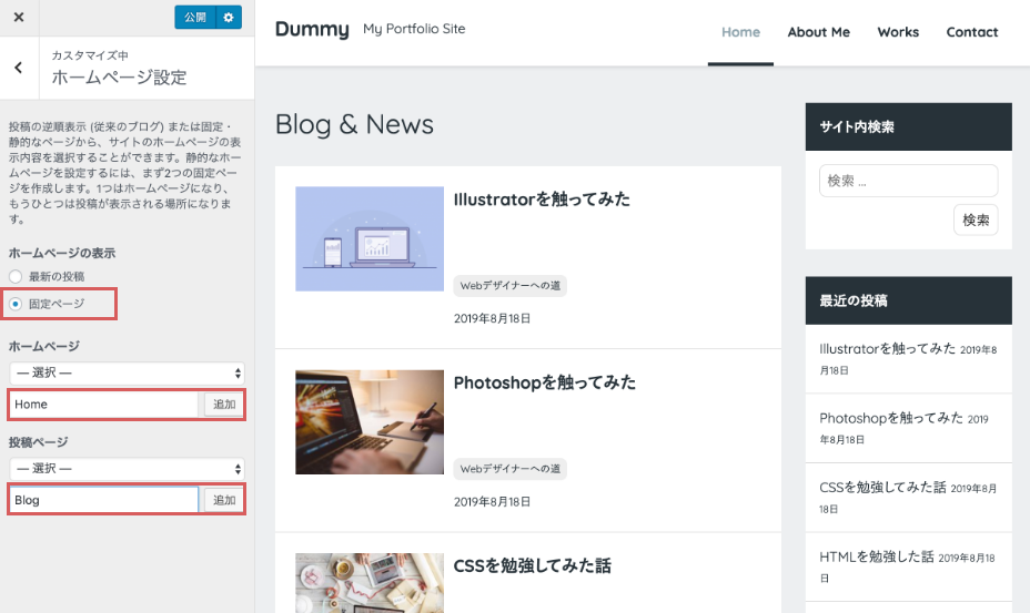 | ホームページ | + 新規固定ページを追加 「Home」 |