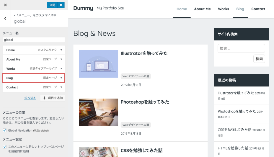 | 投稿ページ | + 新規固定ページを追加 「Blog」 |