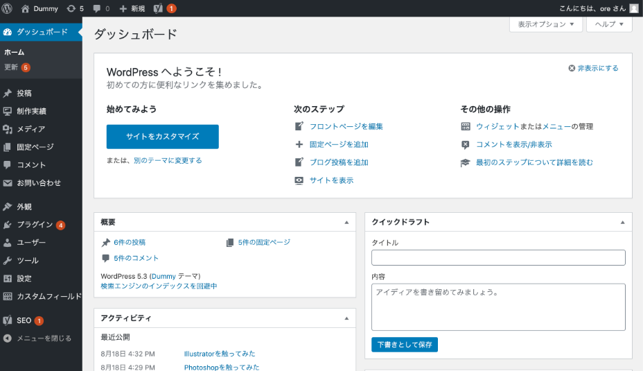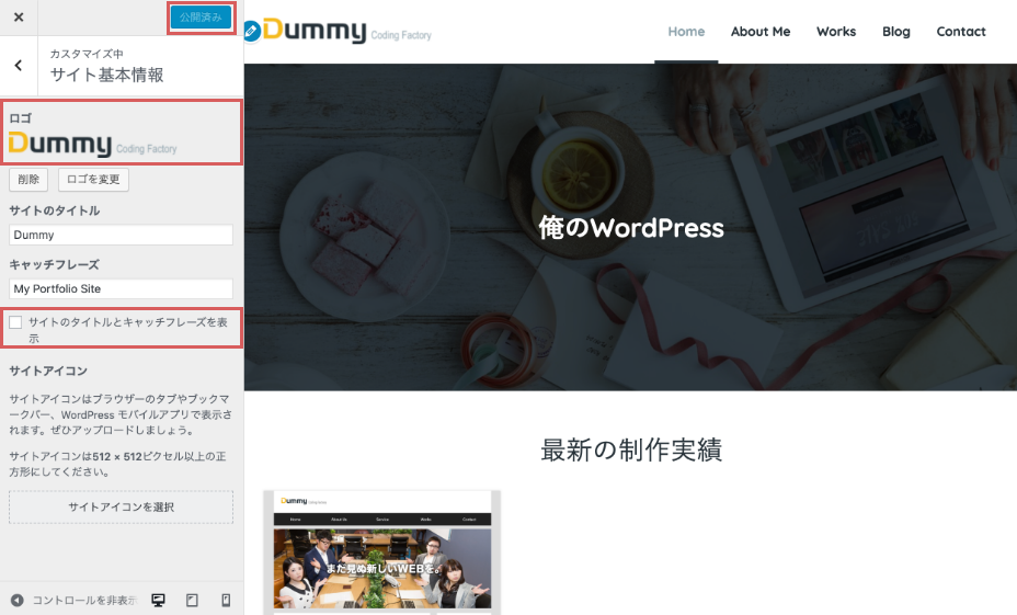 カスタムロゴは、WordPress 4.5 ~追加された、管理画面の「カスタマイズ」から、
